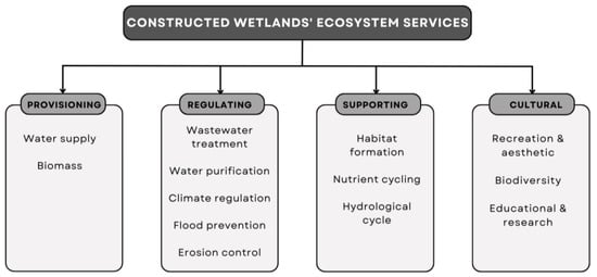- Water supply—Constructed wetlands can treat several types of water, including agricultural wastewater, industrial wastewater, municipal wastewater, stormwater runoff, landfill leachate, and mining water. Treated wastewater is expected to be appropriate for reuse in a variety of settings, including construction and agricultural irrigation. Shingare et al. [45] revealed that the practice of using untreated or treated wastewater for agricultural irrigation, particularly in the least developing countries, poses a significant risk to human health due to the presence of pathogens in the water. Building a constructed wetland is one of several methods for purifying wastewater with higher enteric pathogen removal efficiency and converting it into a resource that can be used for agricultural irrigation. García-Herrero et al. [29] also described how additional agricultural benefits might come from the potential reuse of wastewater from CWs, considering it as an ‘extra’ income for avoided losses on production due to drought events equal to 20% on gross saleable production.