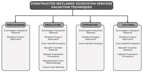 - Second, this review focused on the ecosystem services of constructed wetlands and the different valuation techniques applicable or suitable for assessing their values. A comparison of the advantages and disadvantages of each valuation technique may be conducted when applying them to the different categories of ecosystem services. Furthermore, a comparison may also be performed for the case of using appropriate parameters of wetlands for water treatment, such as the water quality of the treatment.