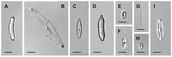 In our investigations, 55 species and infraspecific taxa of diatom algae from the genera Achnanthes Bory, Aulacoseira Thwaites, Diatoma Bory, Diploneis Ehrenberg ex Cleve, Encyonema Kützing, Epithemia Kützing, Eunotia Ehrenberg, Fragilaria Lyngbye, Fragilariforma D.M. Williams and Round, Frustulia Rabenhorst, Gomphonema Ehrenberg, Halamphora (Cleve) Levkov, Hannaea Patrick in Patrick and Reimer, Hantzschia Grunow, Luticola D.G. Mann, Mayamaea Lange-Bertalot, Navicula Bory, Neidium Pfitzer, Nitzschia Hass, Pinnularia Ehrenberg, Planothidium Round and L. Bukhtiyarova, Pseudostaurosira D.M. Williams and Round, Rhopalodia O. Muller, Sellaphora Mereschowsky, Staurosira Ehrenberg, Staurosirella D.M. Wiliams and Round, Surirella Tyrpin, Synedra Ehrenberg, and Tabellaria Ehrenberg ex Kützing were detected (Table 2 and Figure 2A–I).