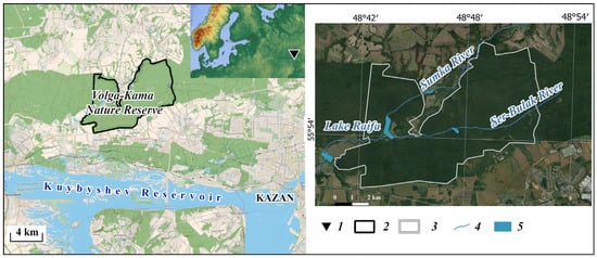 Location of the Raifa forest sector of the Volga-Kama State Nature Biosphere Reserve in the Russian (East European) Plain. 1—location of the Volga-Kama Reserve; 2 and 3—the border of the Raifa forest sector of the reserve (using Open Street Map (left) and satellite imagery from Google Earth (right)); 4—main rivers; and 5—lakes.