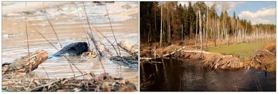The Eurasian beaver (C. fiber L.) (left) and the results of its construction activity (right) on the Ser-Bulak River (the photographs were kindly provided by the administration of the Volga-Kama State Nature Biosphere Reserve).