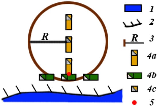 Scheme of a test plot for determining the influence of beavers on riparian vegetation. 1—waterbody (river or lake); 2—riverbank/lakeshore, 3—radius R = 17.84 m; 4a—inner transects (3 m × 7 m), 4b—along-bank/shore transects (3 m × 7 m), 4c—test plots (1 m × 1 m); 5—starting point with notation sign.