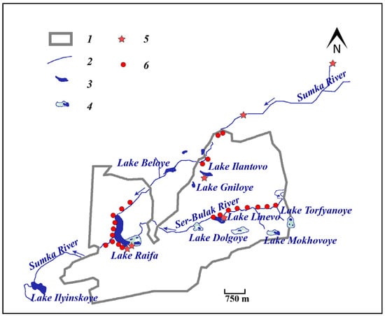 Map of the location of the studied test plots. 1—the border of the Raifa forest sector of the Volga-Kama Reserve; 2—rivers; 3—lakes; 4—wetlands; 5—the places where beavers were released in 1996 on the territory of the reserve and in its buffer zone; 6—the test plots studied.