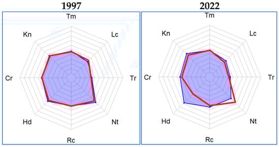 Average characteristics of environmental conditions (in points, according to the Tsyganov indicator values) in 1997 and 2022.