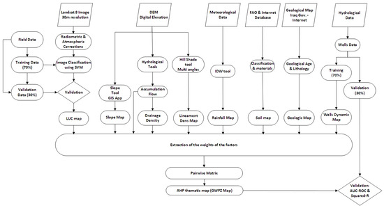 In the last few decades, various methods have been used to determine GWPIs. Some are traditional, relying on physical studies and visits to the region, for example, two-dimensional (2D) geophysical surveys [9], which necessitate intensive fieldwork, while others are more advanced and have attempted to incorporate recent technologies. Most of these techniques are based on multi-parameter statistical methods [10], including the decision tree model [11], principal component analysis (PCA) [12], the logistic regression model [13], Gravity Recovery and Climate Experiment (GRACE) [14], and another model called DRASTIC-LU/LC [15], which means “Depth to water, net Recharge, Aquifer media, Soil media, Topography, Impact of vadose zone, and hydraulic Conductivity”. The integration of a Geographic Information System (GIS) and RS techniques with an Analytical Hierarchy Analysis (AHP) has produced an innovative model technique that is easy to use and produces precise results [16].