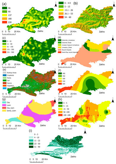 Slope is a critical hydrological factor for recharging the GWPI [60]. The inclination of mountainous and elevated regions significantly influences the formation of zones with a high groundwater potential [61]. An increase in slope will increase water runoff and decrease water infiltration into the ground. A total of 43% of the Zakho region is categorized as a high-slope region, 18% is a medium-slope region, 34% is a low-slope region, and the rest (5%) is a very-low-slope region (Figure 5i).