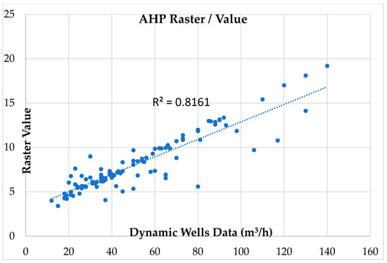 The well data are composed of various types of information (depth, static, dynamic, yield, etc.). Dynamic well data, such as the water level and discharge rate, are important in the Analytic Hierarchy Process (AHP) method for determining the Groundwater Potential Index (GWPI), because they provide critical information about the behavior and characteristics of the groundwater system. Dynamic data from groundwater wells are time-varying measurements of various parameters related to groundwater behavior collected from monitoring wells. These measurements provide insights into how groundwater levels and flow rates change over time, allowing for a better understanding of the dynamic nature of groundwater systems. Dynamic well data provide a direct measure of the hydraulic head and discharge rate of groundwater in a well and can be used to estimate the recharge rate, transmissivity, and other hydrogeological parameters. These parameters are essential for understanding the flow and storage of groundwater in aquifers and for identifying areas of high and low groundwater potential. By incorporating dynamic well data into the AHP method, it is possible to refine the assessment of groundwater potential by considering not only the geological and hydrological conditions of an area but also the actual performance of the groundwater system. This information can then be used to support decision making for groundwater management, water resource planning, and other water-related activities. In summary, the integration of dynamic well data into the AHP method for determining GWPI is important, because it provides a more comprehensive understanding of the groundwater system and allows for more accurate and reliable assessments of groundwater potential. The Inverse Distance Weighting (IDW) is the easiest, most accessible, and one of the most accurate interpolation methods. The IDW method operates under the assumption that values at nearby sampled sites can be used to estimate values at unsampled locations [59]. As the accuracy of the value of the point increases, the nearby sampled points become closer to the untested point. The remaining wells (30%) were used for validation (Figure 5h). When used as a factor within the AHP framework, dynamic well data add a realistic, time-based component to decision-making processes. They improve the precision, dependability, and applicability of AHP-based analyses, allowing better-informed decisions to be made on groundwater potential, resource management, and environmental protection.