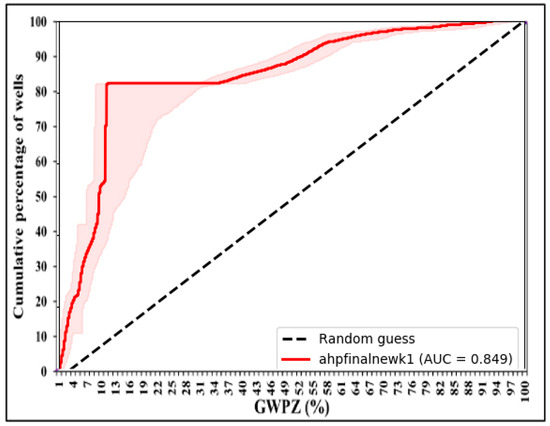 In the realm of AHP–GIS for groundwater delineation, the ROC–AUC can be used to evaluate the performance of the AHP model in effectively categorizing potential groundwater zones based on the provided weights and variables. The procedure involves first calculating the ROC curve by adjusting the classification threshold for potential zones and subsequently computing the AUC to distinguish between zones of high and low potential. To compare the True-Positive Rate (TPR) and False-Positive Rate (FPR), an R-squared analysis can be employed to gauge the degree of alignment between the weights allocated through the AHP and the actual GIS values of the groundwater potential for groundwater delineation [47]. Validation is a technique used in the AHP method to evaluate the performance of the model by dividing the data into training and validation sets, using the training data to train the model and the validation data to evaluate its performance. The existing dynamic well data were divided into two groups: a validation group of 30% and a training group of 70%. The training group was used to generate a thematic map of the dynamic well data and to identify potential groundwater zones. The validation group was then used to assess the accuracy of the thematic map by comparing the predicted results with actual data.