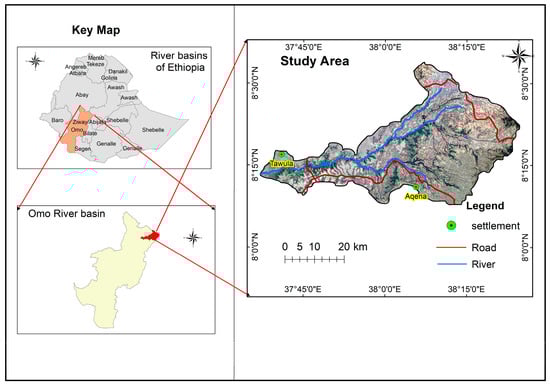 The Wabe watershed, originating in the northeastern region, is recognized as one of the primary tributaries within the expansive Omo River basin. The Wabe River originates from the Guraghe mountain range and then joins the Gibe River within a sub-catchment of the Omo basin. The area under consideration is within the Guraghe zone, situated in Central Ethiopia, at an estimated distance of 160 km from Addis Ababa, the country’s capital city. The Wabe River catchment lies situated between 07°50′0′′ and 08°40′0′′ N and 37°40′0′′ and 38°20′0′′ E (Figure 1), with elevations ranging from 1014 to 3611 m above sea level and a drainage area of about 1840 km2.The study area is accessible through an asphaltic road from Addis Ababa to Welkite and then through a weathered gravel road to the catchment. Several interconnected all-weather roads could render good access within the catchment.