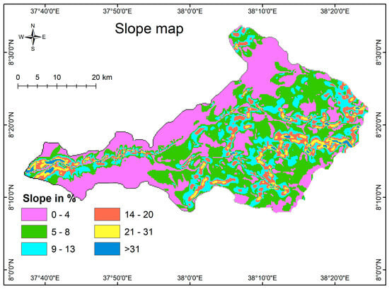 The slope map for the designated research area was generated by employing the spatial analysis tool inside the slope module of ArcGIS 10.8 in conjunction with a digital elevation model (DEM). The slope map of the Wabe catchment (Figure 3) illustrates that the slopes within the study region exhibit a range of slopes and are divided into six categories: 0–4% (very gentle), 5–8% (gentile), 9–13% (moderate), 14–20% (moderately steep), 21–31% steep, and greater than >31% is a very steep slope (Figure 3). Areas with a slope of 0 to 7 degrees typically suggest flat or plain terrain, which is excellent for surface water settling and infiltration. Consequently, this location may have groundwater potential.