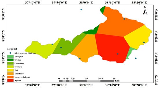 The National Meteorological Agency’s Hawasa branch provided the long-term weather data. Daily rainfall data with the reference years (1991–2021) for eight long-term records of rainfall stations located around or inside the catchment are used to compute rainfall’s spatial and temporal variation. These data generated the Wabe catchment’s summer, winter, and mean annual rainfall distributions.