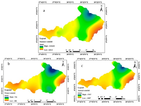 Average rainfall maps ((a) summer, (b) winter, and (c) annual) of the Wabe catchment.