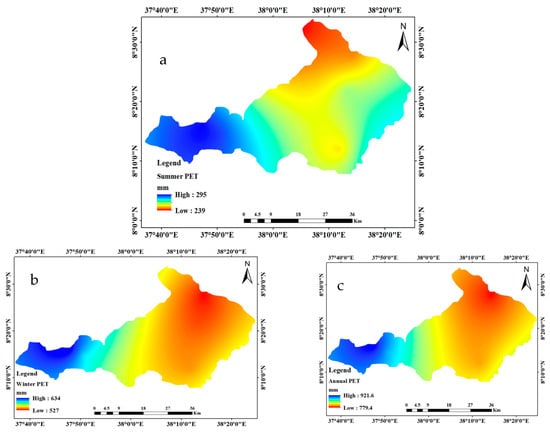 Average potential evapotranspiration ((a) summer, (b) winter, and (c) annual) of Wabe catchment.