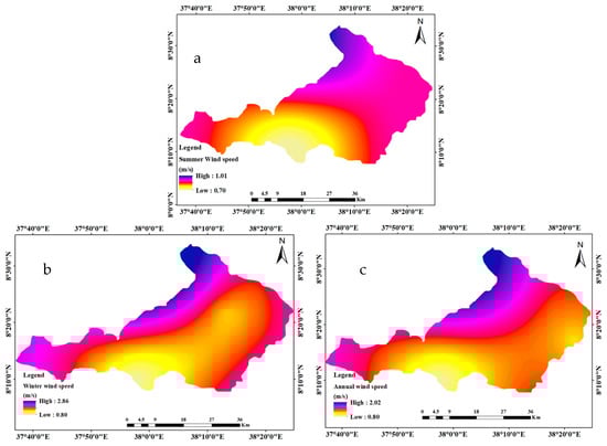 Seasonal and annual average wind speed maps ((a) summer, (b) winter, and (c) annual) of Wabe catchment.