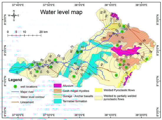 Two groundwater flow directions were identified in the study area. The first one is from Tawula–Welkite in the west to the Weliso areas in the north, suggesting that this region is one of the basin’s recharge sources. The second is the principal flow direction, which is anticipated to move from the Guraghe and southeast ridges of the watershed to the northwest and western regions. In addition to the high-discharge springs, high-discharge boreholes have lately been drilled relatively close to these water source locations (southeastern). These are the primary water sources for the people living in these catchment areas. They are also utilized for irrigation in some areas of the catchment. This means that the Guraghe Ridge is one of the catchment’s primary water sources. Figure 8 shows the groundwater level map of the study area.