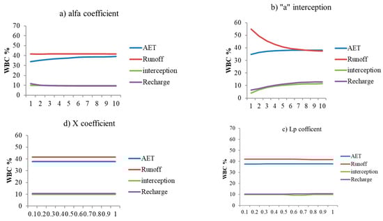 Identifying the model parameters that have the greatest influence on the catchment process is vital for understanding the catchment process and evaluating the anticipated uncertainties. The model WetSpass-M classifies its variables into two unique categories: local variables, encompassing aspects such as slope, land use, and soil characteristics, and global variables, encompassing interception, alpha factor, Lp factor, and average intensity factor. Analyzing parameter sensitivity involves aggregating average values of meteorological data from the input dataset of the WetSpass-M model. No modifications have been made to the existing biophysical data. A detailed examination was undertaken in order to identify the sensitivity of many factors, including the “a” intercept, alpha coefficient, and Lp coefficient. As a result, a suitable range of values has been determined for these parameters. Each repetition of the experiment increased the parameter values by 1%. All independent variables and other relevant elements remained constant except for the objective parameters. The target variable was incrementally increased from 25% to 100% in order to assess the impact of changes in the input variable on the different components of the water balance. The remaining variable, however, was maintained at a constant level. Figure 12 illustrates the water balance component’s (WBC) response to variations in the parameters and input variables. Three key input variables were incorporated into the Wabe River watershed model simulation: land-use factors, rainfall intensity, and interceptions. Analyzing the global parameters of the model, it becomes apparent that the components related to the balance between white blood cells (WBC) and water are highly sensitive.