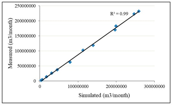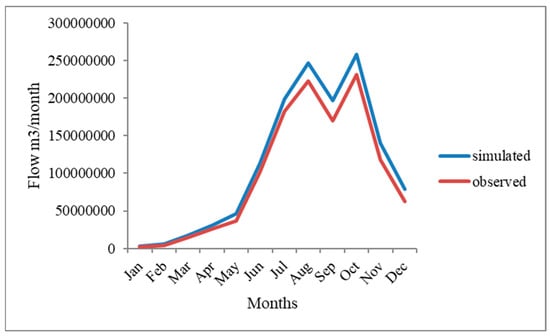 In contrast, an R2 value greater than 0.7 indicates a high correlation. In addition, a coefficient of determination of −1 indicates a negative correlation, whereas a value of 0 indicates no correlation between the two variables. Figure 13 shows that there is a correlation between the measured and simulated flow data. A comparison of the simulated and observed average monthly flow data is illustrated in Figure 14. Therefore, our findings align with the established range of statistically significant positive associations, thus meeting the acceptable threshold. Based on observed stream discharge data, the simulated models’ surface runoff and baseflow parameters were determined.