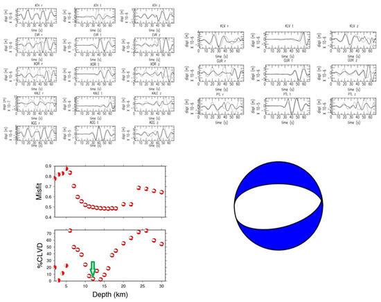 Five broadband stations with three component seismometers, with various azimuth coverages and epicentral distances of less than 3°, were chosen, and their regional data were examined. The preparation of the data, which includes the deconvolution of the instrument response, integration of velocity to displacement, and rotation of the horizontal components into radial and transverse components, is the first step of the operation. The long-period component of the signal is then added to complete the inversion. By considering the average misfit and compensated linear vector dipole (CLVD; Column 9, Table A1), the quality of the moment tensor solutions can be assessed. The minimal misfit is represented by letters A–D for each solution, and the percentage of CLVD is represented by digits 1–4.