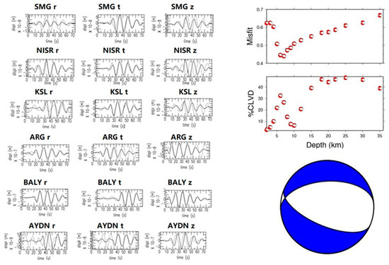 A moment tensor inversion methodology was employed using Ammon’s software [37], as theoretically reported in [37,38,39]. For a specific velocity structure, this method computes synthetic seismograms that are then directly compared with real seismograms. Kennett’s reflectivity approach was used to calculate the Green Functions, as performed by Randall [37]. A suitable 3D velocity model—in our case, Papazachos’ model—is paired with a synthetic model for the three fundamental flaws.