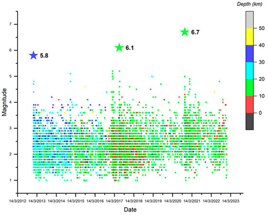 Thirteen broadband stations in the study area were equipped with three seismometer components (Figure 1). Detailed information is presented in Table 1. Strong earthquakes that occurred in the North Aegean region over the last ten years (2013–2023), as well as the aftershocks they triggered, are shown in Figure 2. The main earthquakes are marked with red stars, with orange and blue triangles corresponding to the seismological stations from Seismology Laboratory of Aristotle University (AUTH) [10] and National Observatory of Athens—Institute of Geodynamics (NOA–IG) [11]; finally, red lines represent the main faults for the study area as originated from [33], available at https://land.copernicus.eu/imagery-in-situ/eu-dem. Bathymetry was obtained using Emodnet Bathymetry [33] and DEM. Light blue represents cities near the epicenter. The distribution of the epicenters for 2013–2023 also appears on the map. The size and color of the points depend on their magnitude. The size of the circles indicates the magnitude of seismic events. The larger circles indicate higher magnitudes.
