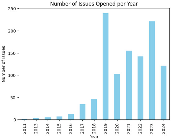In Figure 2, we have the distribution of the opened issues over time. As we can observe from the plot, we have two peaks, one in 2019 and one in 2023. The mean number of citations for these articles is 11.98, and the most cited article is titled “Internet of things (IoT) and the energy sector”, cited 460 times. Of these issues, 442 are still open, while 558 have been closed. The mean lifespan of issues is 135.31 days. The mean number of comments on an issue is 24.32, and the one most commented on has 1907 comments.