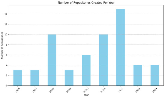 In Figure 3, we have the distribution of the created repositories over time. The mean size of these repositories is 8894.78 KB, and the biggest is 156,808 KB. Moreover, we have nine different programming languages used for blockchain projects in the Earth field, and the top three most used are JavaScript (14 times), TypeScript (4 times), and Solidity (4 times). For this result, it is important to highlight that only 31 repositories declare the programming language used. Finally, the mean number of open issues per repository is 1.57, and the one that has 70 issues open is a content delivery network (CDN) that uses Ethereum and IPFS.