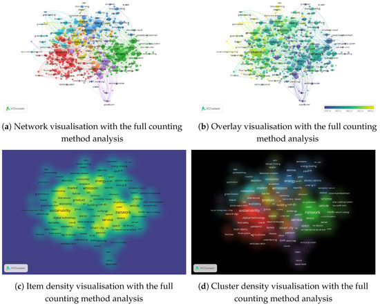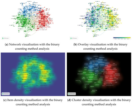 The bibliometric analysis provides us with the first overview of the main topics of discussion in the literature. From the full counting analysis, we can observe in Figure 4a that the prevalent topics of interest are related to sustainability, smart city, service, network, energy, emission, waste, product, and market. This is also confirmed by Figure 4c,d, which also show the breakdown into clusters, such as agribusiness, green finance and market, waste products, service providers, air pollution and IoT networks, and finally, p2p energy trading and electric vehicles. Finally, from Figure 4b, it can be seen that topics such as sustainability overlap across multiple clusters, while others, such as waste, are more specific to their group. On the other hand, with the binary counting analysis, we can analyse the breadth of topics in the dataset and minimise the influence of common terms. Figure 5a shows that we have three big clusters: one related to network, smart city, vehicles, and traffic; another one related to sustainability, innovation, and food and agriculture supply chain; and finally, the last one related to energy, carbon emissions, greenhouse gases, and the p2p energy trading market. This result can also be observed in Figure 5c,d. Also, in this analysis, as can be seen in Figure 5b, topics such as sustainability, supply chain, artificial intelligence, and carbon emissions cross-cut across several clusters; in contrast, others, such as peer, grid, and driver, are more class-specific.