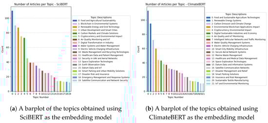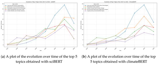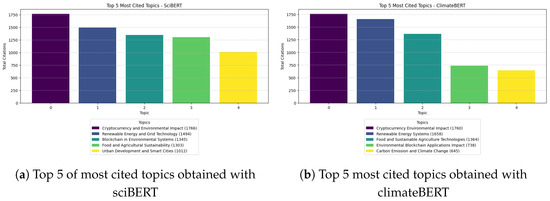 Going into more detail about the topics of interest in scientific articles, in Table 3, we can observe the topic modelling results obtained by applying the two BERT models. The distribution of these is also plotted in Figure 6, providing an even clearer idea of the main interests of the scientific community. Among the topics obtained with the SciBERT model, it is noticeable that the most discussed topics concern general topics related to the environment (Blockchain in Environmental Systems), agriculture and food (Food and Agricultural Sustainability), energy (Renewable Energy and Grid Technology), and urban development (Urban Development and Smart Cities). Other smaller topics discuss recycling, emissions, air quality, space and planets, and, last but not least and no less interesting, aspects of cryptocurrency and mining. These results are also confirmed by the topics obtained with the ClimateBERT model, which, in addition, extrapolates on topics such as “Sustainable Textile Manufacturing”, which is very important nowadays due to the emissions caused by the mass production of clothes and the difficulty of recycling them once they are discarded. The evolution of these main topics in recent years, specifically the top five, can be seen in Figure 7. It is interesting to note the steady growth in topics related to agriculture and food, underscoring how even sectors historically characterised by manual labour are facing technological innovations. Also interesting in Figure 8a is the growth in themes related to the environment in general over the last year. This highlights how the cross-cutting use of blockchain for environmental monitoring and prevention is increasingly impactful. One difference between the two models, as noted in Figure 8b, is related to the cryptocurrency topic, which is not present in the top five of the SciBERT model. While the latter is the most extreme among the top topics, it is one related to urban development, which is not highlighted by ClimateBERT. This result is interesting in that one would expect more technical topics (cryptocurrencies) to be closer to a model trained on scientific data, while urban development topics are more related to an “environmental” model such as ClimateBERT. Evidence of how cryptocurrencies are impacting the environment, an aspect of interest to researchers, is shown in Figure 8, where these topics are the most frequently mentioned. In both cases, this is followed by topics related to energy, a sector that offers great application possibilities, such as renewable energy certification, energy trading, and energy management. Finally, the other most cited topics concern the environment, agriculture, food, and finally, climate change.