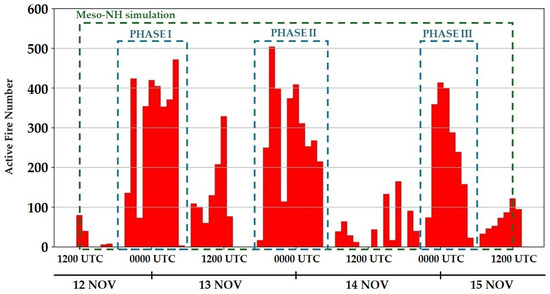 Hourly active fire number (AFN) distribution between 0600 UTC on 12 November and 1800 UTC on 15 November 2023, from GOES-16 satellite. The blue dashed-line boxes, called PHASE I, PHASE II, and PHASE III represent the periods with the highest AFN values. Moreover, the green dashed-line box indicates the period simulated by the Meso-NH model.