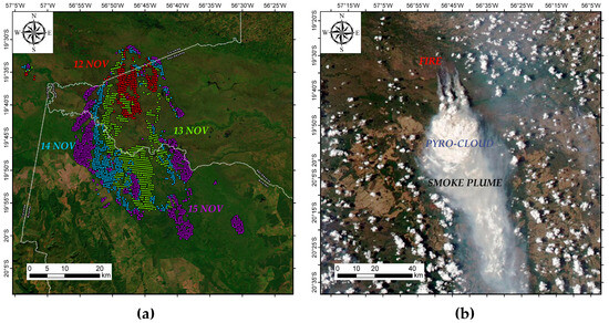 Figure 2 is complemented by Figure 3, which displays the spatial distribution of the AFN from the NOAA-20 satellite. Figure 3a shows that the AFN on 12 November (red area) extends about 20 km southward, but the AFN on 13 November (green area) covers a region of approximately 25 km of extension, likewise headed southward. The same figure illustrates a lateral fire spread on 14 November (blue area) and 15 November 2023 (purple area). Figure 3b shows a satellite image taken in the afternoon on 12 November, around 15:00 local time (1800 UTC). It can be seen that throughout the day, the fire emitted a large number of aerosols. Additionally, the smoke plume generated by the fire is transported southward and probably had a large vertical development, clearly indicating the development of pyroconvective clouds.