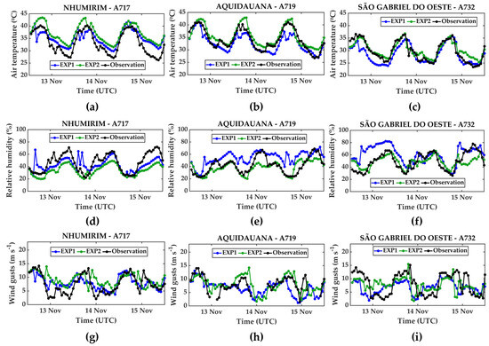 Comparison between model (EXP1 and EXP2) and observation for the 72 h of simulation: (a–c) air temperature at 2 m; (d–f) relative humidity at 2 m; (g–i) wind gusts at 10 m.