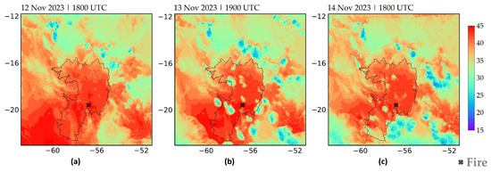 Air temperature at 2 m (unit: °C) simulated at 2.5 km resolution [EXP1]: (a) 12 November 2023 at 1800 UTC, (b) 13 November 2023 at 1900 UTC, (c) 14 November 2023 at 1800 UTC. The black contour line represents the Pantanal international boundary.