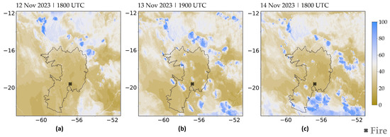 Relative humidity at 2 m (unit: %) simulated with 2.5 km resolution [EXP1]: (a) 12 November 2023 at 1800 UTC, (b) 13 November 2023 at 1900 UTC, (c) 14 November 2023 at 1800 UTC. The black contour line represents the Pantanal international boundary.