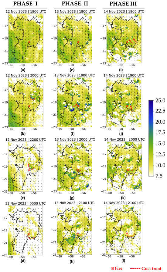 Wind gusts (colored, unit: m.s−1) and wind direction at 10 m (arrows) simulated at 2.5 km resolution [EXP1] (a–d) PHASE I; (e–h) PHASE II; (i–l) PHASE III. The black contour line represents the Pantanal international boundary.