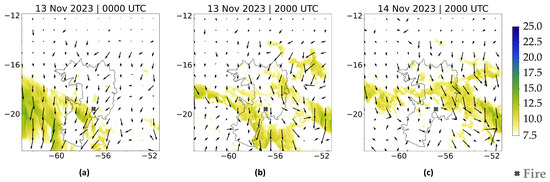 Figure 5 displays the spatial distribution of air temperature, highlighting key moments throughout the period and preceding the peak AFN values. The maximum temperatures are simulated around 1800 UTC, presenting a greater spatial extension of values above 40 °C, particularly over the Southern Pantanal (Figure 5a). However, some cores with relative minima (around 25 °C) appear from the late afternoon in the Pantanal (not shown). Since the air temperature field at 1800 UTC on 13 November is similar to the present in Figure 5a, Figure 5b displays the environment one hour later (1900 UTC), showing the relative air temperature minimums over Pantanal. This moment represents the change in the wind regime over the region after 1800 UTC. By 14 November, these cooler areas become more localized and appear earlier, but high temperatures persist across the region (Figure 5c).