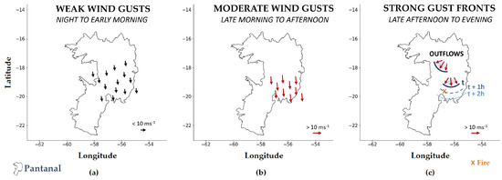 Schematic diagrams of airflow dynamics, which represent the pathways of air parcels along the events, can be very useful for summarizing critical situations. For the present study period, a schematic diagram is proposed and depicted in Figure 10. It categorizes the environments found in this study into three periods. PERIOD I corresponds to the southward airflow over the Pantanal during the night and early morning, resulting in weaker wind gusts in the study region (Figure 10a). PERIOD II (Figure 10b) corresponds to the intensification of the wind gusts on a regional scale along the day and prevailing from the north. Finally, PERIOD III represents the gust fronts at the surface produced by convective outflows that reach the ground and spread radially. Here, the gust fronts were simulated with more intensity propagating southward, as indicated in Figure 10c from the notation time (t), t + 1 h and t + 2 h.