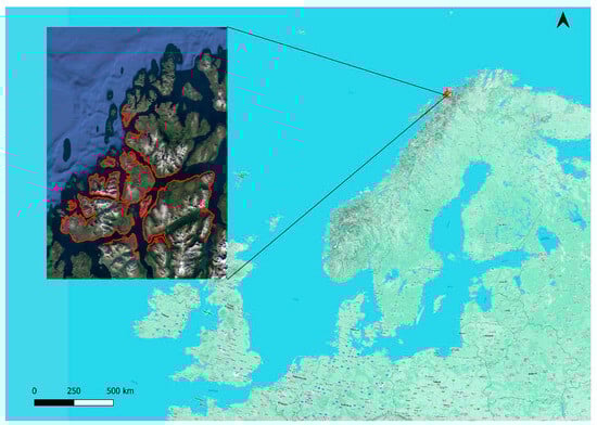 A diverse combination of physical factors are exhibited in mainland Norway, resulting in a variety of climate conditions. According to Ketzler et al. [], Norway covers five climate zones (Köppen classification). Being located on the west side of the Scandinavian Peninsula, the North Atlantic Current moderates the climate to a more temperate level than what it is expected from the given geographical zone. Specifically, a notable temperature increase has been detected over the past two decades. In Northern Norway, the high mountain plateaus have a subarctic appearance, including permafrost phenomena. It is notable that some parts of Norway lack both vegetation and soil, but they are covered by block accumulations with vertical extensions occasionally reaching several meters, with an absence of finer material between the blocks. Regarding the effects of sea level rise, only minor effects are anticipated for the Norwegian coast during this century. More specifically, there will be increases up to 0.6 m in some areas, largely offset by a postglacial rebound. The number of days with snow cover will potentially decrease significantly across Norway by up to 180 days per year. Climate models suggest that permafrost in areas like Finnmarksvidda may completely defrost by 2050 and only some small permafrost areas that are in mountainous areas over 1800 m a.s.l will be able to remain []. Tromsø (Figure 1) is an elongated NNE–SSW-striking basin, with a length of 140 km and a width of 60 km [].
