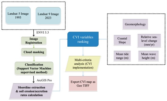 After the pre-processing of the images in ENVI software was finished, the images, which were all at 30 m spatial resolution, were then processed in ArcGIS Pro software (Version 3.1). In this particular program, the shoreline extraction and soil erosion/accretion rates calculation was carried out. The factors used to calculate the CVI were six. Specifically, those factors were geomorphology, coastal slope, mean tide range (m), shoreline erosion/accretion (m/yr), relative sea level change (mm/yr), and mean wave height (m). The above variables took integer values ranging from one (1) to five (5). Each of the parameters was categorized based on the potential contribution they have to the natural changes of the coast, as the sea level rises []. The higher the value, the more vulnerable the areas are to that parameter. A multi-criteria analysis was applied for CVI implementation. In more detail, initially each factor was calculated separately, with the format of the files being in vectors (polylines). To classify each factor in each of the 5 categories, according to their vulnerability, Table 2 was used.