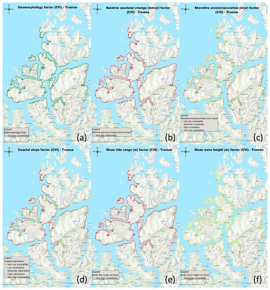 Regarding the coastal slope factor, as can be seen from Figure 4d, the vulnerability along almost the entire length of the coastline is very high. There are few points where the vulnerability is very low or low. On some parts of the coastline, mainly on the part of the coastline located to the east of the island of Tromsø, the vulnerability is moderate. Specifically for the island of Tromsø, the vulnerability along almost the entire length of the coastline is very high with reference to the coastal slope factor. Lastly, concerning the factors of (a) geomorphology, (b) relative sea level change, (e) mean tide range, and (f) mean wave height (Figure 4a, Figure 4b, Figure 4c, Figure 4e, and Figure 4f respectively), the value is the same for the entire length of the coastline. Specifically, for the factor of geomorphology, vulnerability is very low; for the factor of relative sea level change, vulnerability is very high; for the factor of mean tide range, vulnerability is also very high; and finally, for the factor of mean wave height, vulnerability is moderate.