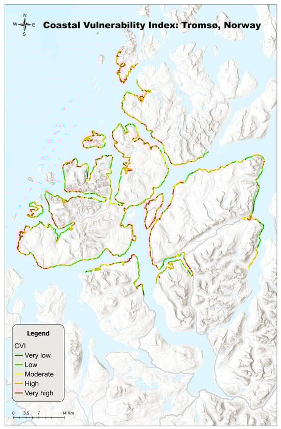 Our results showing the high vulnerability of the Tromsø Island coastal region are in line with other studies []. In other Arctic regions, it appears that coastal vulnerability is mostly moderate. In more detail, in Longyearbyen on Svalbard, it appears that the most vulnerable areas are the Longyearelva Delta, while higher erosion values are found along the cliffs east of the Longyearelva Delta, which are human-altered sections. After the calculation of CVI, the results showed vulnerability that ranged from very low to high. More analytically, on the delta coast of Longyearelva, the high vulnerability is related to the low coastal slope of the delta system as well as the possible rise of erosion because of the limited sediment supply. The change of geomorphology, as well as the slope of the coastal zone, because of human actions, like the build-up of artificial coast while constructing the new port and roads, had a crucial role in the change to the shoreline and by extension the CVI []. The specific index has also been calculated for the Eastern Gulf of Finland coastal zone (the Baltic Sea). In this particular study, moderate vulnerability was also found on a large part of the coastline under study, while in several parts, the coastline was low []. Another similar study has been conducted on the Croatian coast of Istria. With the coasts of Croatia and Istria being mostly rocky and with limestone and dolomites being their key composition, the effect of erosion is restricted. Moreover, coastal slope, elevation, and landform are critical variables because of the rising sea level in the Adriatic [].