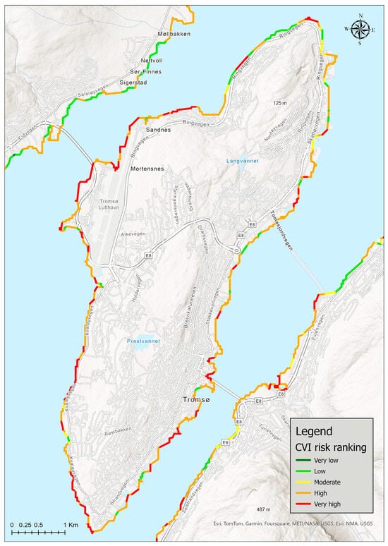 Regarding the oceanographic conditions of the area, three parameters were taken into consideration during the CVI estimation. Those consist of (i) the relative sea level change of the examined area expressed in units of millimeters per year (mm/yr), (ii) the mean tide range expressed in meters, and (iii) the mean wave height conditions expressed also in meters. Data about the relative sea level rise and mean tidal range between 1993 and 2024 were obtained by a tide gauge station installed at the harbor of Tromsø available through the Norwegian Hydrographic Services Mapping Authority database (api.sehavniva.no, accessed on 10 October 2024). Regarding mean wave height, a value of 1.0 m was selected based on the physiographical characteristics of the wider area and in accordance with other similar studies which took place in the wider geographical area [].