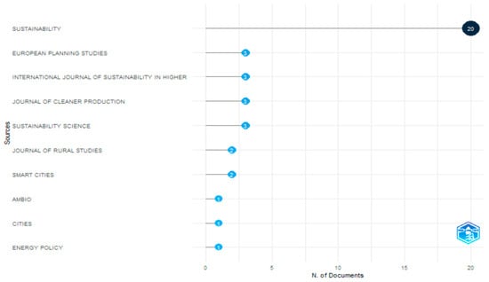 Generally, the ”source” concept refers to a journal, book, conference proceedings series, etc., which published one or more documents included in our database. Figure 3 presents the first 10 most relevant sources from the study sample we examined. It can be observed that Sustainability is the most relevant source, representing 20 papers from the sample.