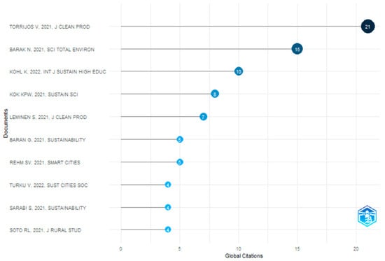 From Table 5, it can be observed that the paper elaborated on by Torrijos and collaborators [56] is the most globally cited document from the analyzed sample. The research focuses, among other issues, on integrating composting systems in bio-technological living labs for educational purposes.