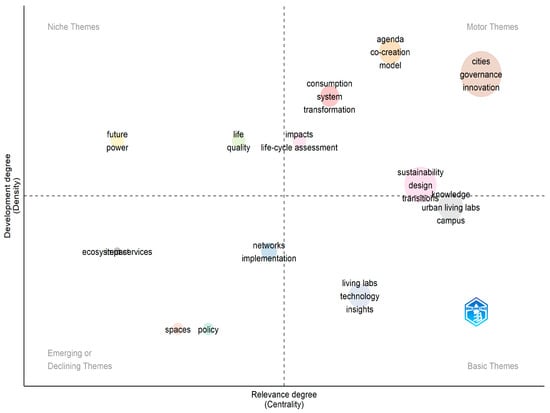 Overall, the figure depicts a pictorial representation of the most popular themes in this research field. The basic themes comprising the clearly established research issues in this area are shown in the bottom-right corner of the figure. The main themes are living labs, technology, urban living labs, etc. The themes increasing in importance in the last years are illustrated in the upper-right part of Figure 5. They primarily consist of three research topics: cities governance, the co-creation approach, and sustainability design. Keyword analysis (Table 6) also demonstrates that significant research has been conducted in these research areas.