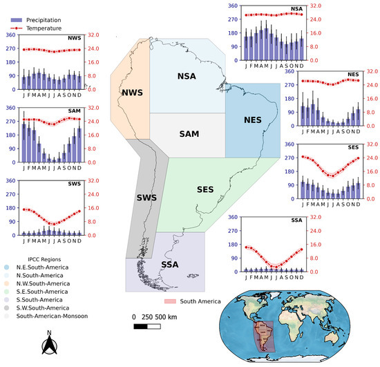 Climate normal for precipitation and air temperature and location of the climate reference regions from the Sixth Assessment Report of the Intergovernmental Panel on Climate Change (IPCC AR6) for South America from 1979 to 2020.