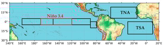 Daily precipitation, maximum and minimum air temperature, and monthly sea surface temperature (SST) data were obtained from January 1979 to December 2020. These datasets were sourced from the National Oceanic and Atmospheric Administration (NOAA) and made available by the Climate Prediction Center (CPC; https://psl.noaa.gov/data/gridded/, 10 accessed February 2021) (Table 2). The SST regions analyzed include Niño 1+2, Niño 3, Niño 3.4, Niño 4, Oceanic Niño Index (ONI), Tropical Northern Atlantic (TNA) and Tropical Southern Atlantic (TSA) (Figure 2).