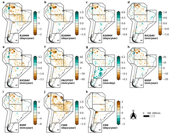 Spatial distribution of trends from 1979 to 2020: number of heavy precipitation days (R10mm) (a); number of very heavy precipitation days (R20mm) (b); number of days above 30 mm (R30mm) (c); max 1-day precipitation amount (Rx1day) (d); max 5-day precipitation amount (Rx5day) (e); annual total wet day precipitation (PRCPTOT) (f); simple daily intensity index (SDII) (g); precipitation on very wet days (R95p) (h); precipitation on extremely wet days (R99p) (i); consecutive wet days (CWD) (j); and consecutive dry days (CDD) (k) over the climate reference regions of the Sixth Assessment Report of the Intergovernmental Panel on Climate Change (IPCC—AR6) on South America. Only values with statistical significance at the 5% level are presented in the maps.