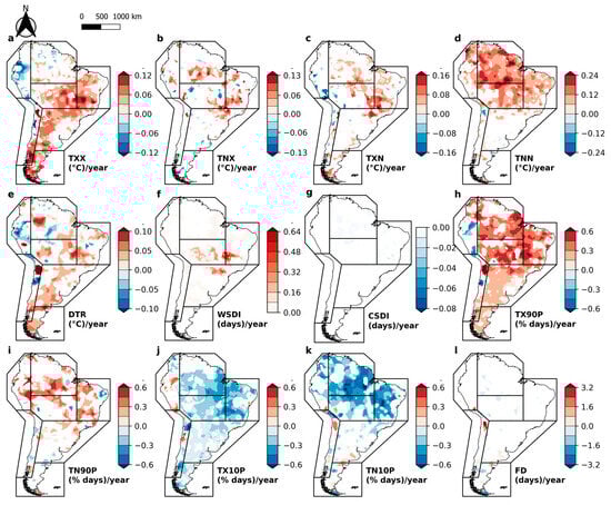 Spatial distribution of trends from 1979 to 2020: warmest day (TXx) (a); warmest night (TNx) (b); coldest day (TXn) (c); coldest night (TNn) (d); diurnal temperature Range (DTR) (e); warm spell duration (WSDI) (f); cold spell duration (CSDI) (g); warm days (TX90p) (h); warm nights (TN90p) (i); cool days (TX10p) (j); cool nights (TN10p) (k); and frost days (FD) (l) over the climate reference regions of the Sixth Assessment Report of the Intergovernmental Panel on Climate Change (IPCC—AR6) on South America. Only values with statistical significance at the 5% level are presented in the maps.