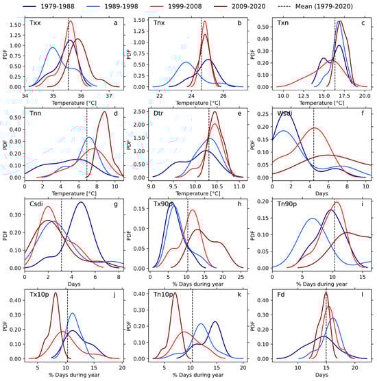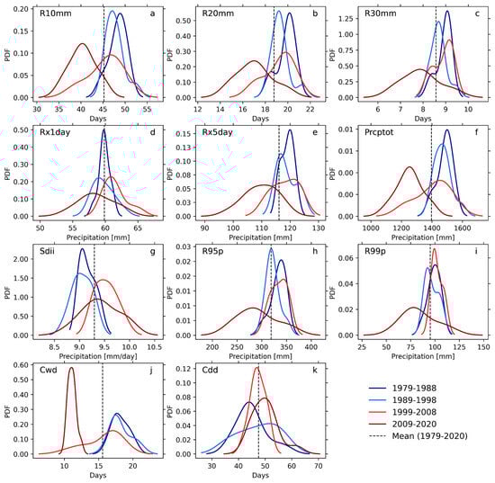In addition, the probability density function (PDF) of the extreme climate indices was analyzed to assess shifts in the distributions of precipitation and temperature extremes over four decades: 1979–1988, 1989–1998, 1999–2008, and 2009–2020. The PDF method provides a non-parametric way to visualize changes in the frequency and intensity of extreme events across time, capturing shifts in both mean and variance [30].