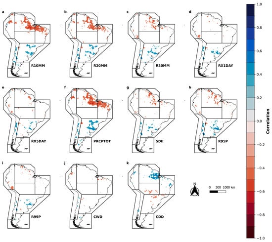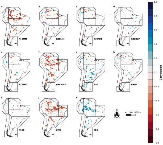 Pearson correlations between Pacific SST anomalies in the Niño 3.4 region and extreme precipitation indices: number of heavy precipitation days (R10mm) (a); number of very heavy precipitation days (R20mm) (b); number of days above 30 mm (R30mm) (c); max 1-day precipitation amount (Rx1day) (d); max 5-day precipitation amount (Rx5day) (e); annual total wet day precipitation (PRCPTOT) (f); simple daily intensity index (SDII) (g); precipitation on very wet days (R95p) (h); precipitation on extremely wet days (R99p) (i); consecutive wet days (CWD) (j); and consecutive dry days (CDD) (k) over the climate reference regions of the Sixth Assessment Report of the Intergovernmental Panel on Climate Change (IPCC—AR6) on South America from 1979 to 2020. Only values with statistical significance at the 5% level are presented in the maps.